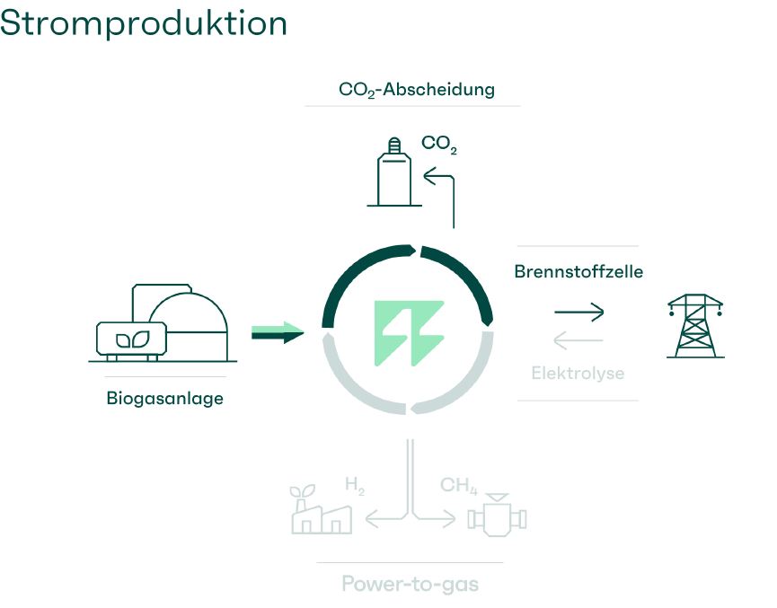 Das bei der Umwandlung von Methangas in Strom frei werdende CO2 wird nicht etwa in die Luft abgegeben, sondern in die ohnehin vorhandene CO2-Infrastruktur der Anlage überführt und kann von dort für industrielle Anwendungen weiterverwendet werden. Auch hier entsteht so eine Nutzungskaskade.